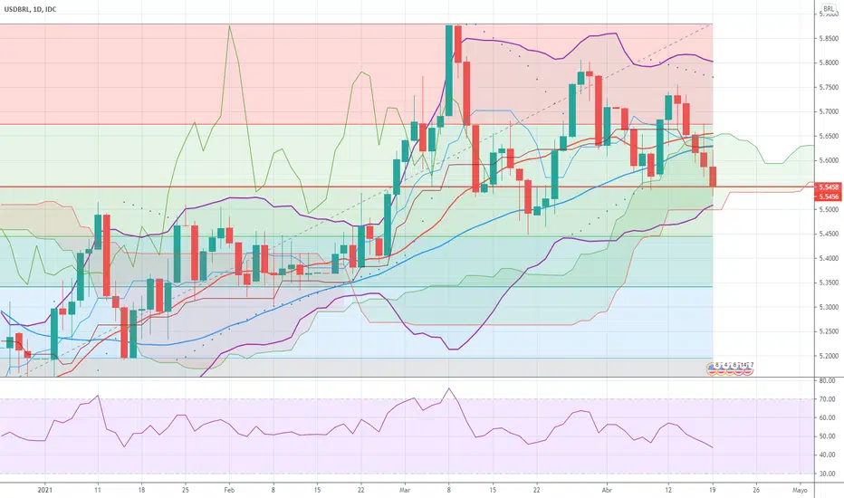 El dólar estadounidense ha estado en una tendencia a la baja durante las últimas 5 sesiones de negociación y el precio logró caer por debajo del nivel de soporte de 5.54 de nuestro retroceso de Fibonacci en 38.2%, si el precio es capaz de consolidar la ruptura se espera que la tendencia bajista continúe. el índice de fuerza relativa está en 44%, lo que permitiría que el par continúe cayendo, las bandas de Bollinger son anchas y el precio aún está por encima de la banda inferior, lo que respalda nuestra predicción de tendencia bajista si la ruptura se consolida, el SAR parabólico sugiere lo mismo, sin embargo, el precio cotiza dentro de la nube de Ichimoku, lo que puede verse como una incertidumbre del mercado.