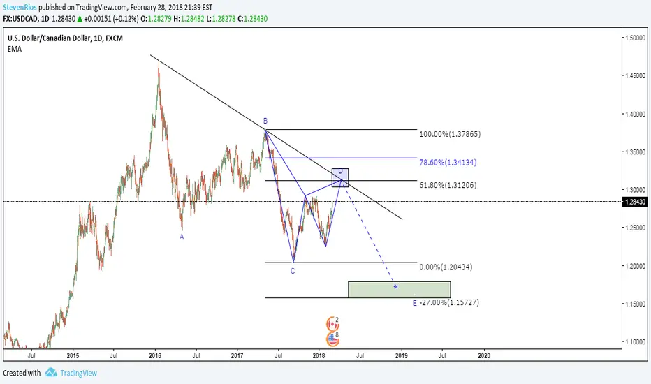 El precio está buscando o está siendo atraído por la línea de tendencia bajista en macro, claramente se puede ver que se está completando la estructura de un patrón armónico... Posiblemente llegue hasta el nivel 61.8% del fibonacci, esperaremos ventas a largo plazo por lo menos hasta la zona del 1.20000 y máximo hasta el 1.16000, allí se completará la 5ta onda de la tendencia actual.