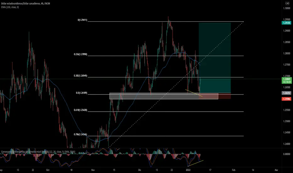 En un grafico de 4 horas en el par USD/CAD tenemos un claro movimiento alcista, se utilizo un fibonacci desde el inicio del impulso alcista hasta donde este termino, el retroceso se situa en el 50% de fibonacci en donde encontramos una zona de soporte fuerte, tambien utilize un MACD en cual nos esta demostrando una divergencia alcista (trazada con lineas color amarillo).