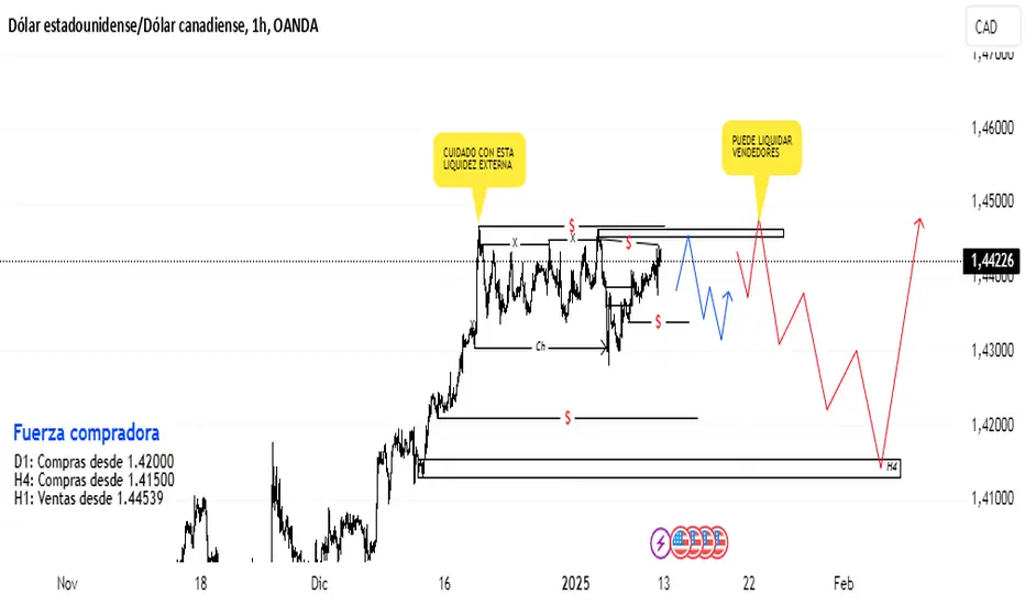 En vista de que tenemos la estructura del precio en mayores temporalidades como referencia (1D y H4), nos indica que el precio probabilísticamente genere un retroceso a zonas de valor de compradores para seguir la tendencia principal del sistema. Dicho retroceso dependiendo de que tipo de fuerza y/o volumen presente el precio al momento de su llegada a la zona, estaría considerando la venta swing.