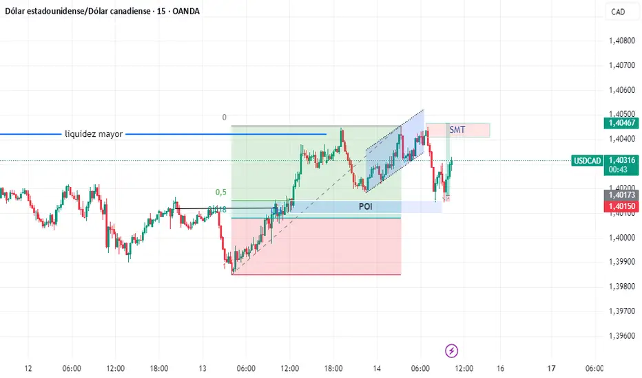 Este análisis se centra en una oportunidad de entrada institucional en USDCAD, combinando estructura de mercado, zonas de liquidez y confirmación técnica en múltiples temporalidades. El escenario se desarrolla sobre un rango alcista en M15, con una clara intención de continuar al alza tras una toma de liquidez en H4.