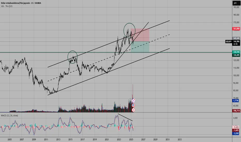 En la imagen podemos apreciar como con el uso de canales podemos encontrar lo que parece ser un patrón histórico de comportamiento en este par de divisas. También podemos ver una notable divergencia en el MACD respaldada por una muy conocida figura de agotamiento, un Hombro-Cabeza-Hombro. Proyecto que el precio podía llegar a los $120 incluso, haciendo una prueba de techo en lo que parece ser un gran proceso de acumulación, pero mantengo en $130 mi proyección.