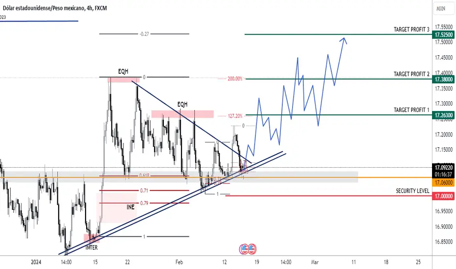 En temporalidades macro se encuentra rebotando en un canal bastante claro, ademas de estar en medio de líneas de liquidez, no pudo hacer un LL y respetó el 0.885 de fibonacci en SEMANAL, en temporalidades mas bajas (4h) el precio viene haciendo una compresión en un triángulo, dejando zonas de líquidez superiores igualmente, se encuentra apoyado en el precio 17.600 que viene siendo una zona de historia en el pasado, la cual ha sido bastante interactuada y respetada, además de esta misma zona estar apoyada en el 0.61 de Fibonacci, que respeta la estrategia tiempo-distancia, ya que el impulso alcista que hubo anteriormente se dió fuerte y rápido, en contraste al retroceso, llegó lento y pausado. y previamente haber roto la linea de tendencia superior del triangulo, me indica que está haciendo un retroceso, al 88.5 apróx para hacer otro impulso y continuar con una tendencia alcista y llegar a la líquidez que tiene pendiente en la parte superior