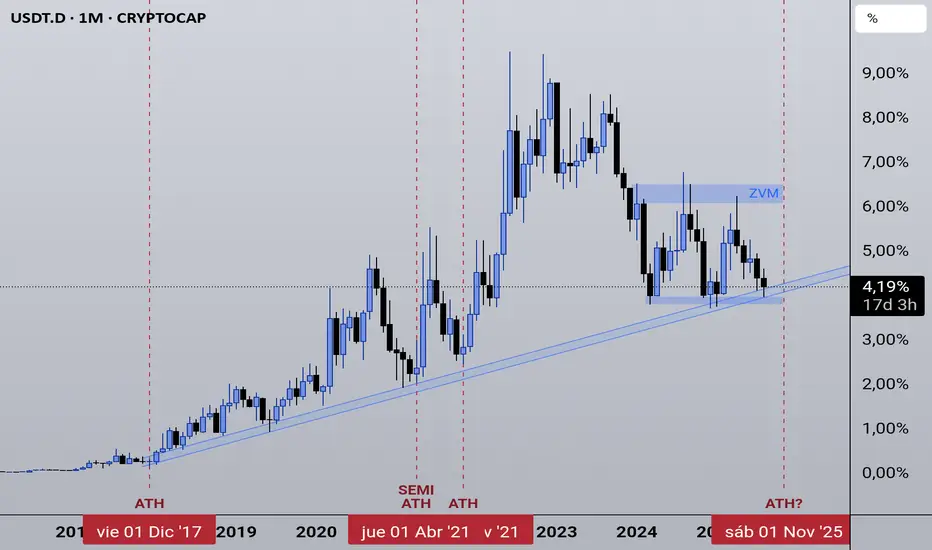 Seguimos viendo como el precio rebota al alza en la trendline de largo plazo de la dominancia de usdt.Cada vez que tocamos ese soporte el precio rebota al alza con lo que vemos caidas en btc y el resto del ecosistema cripto.