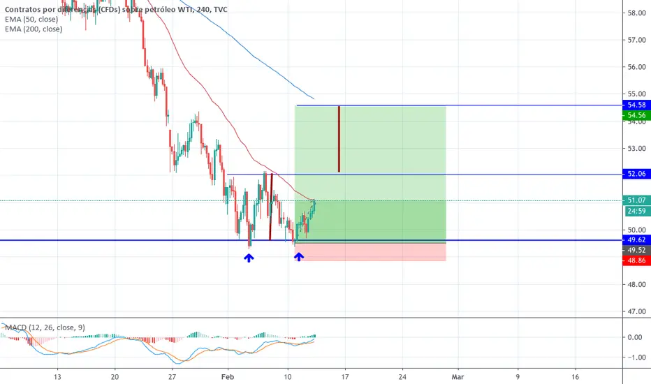 Petroleo WTI formando un tipo de doble suelo. Esta la alternativa de tomar largos en actuales niveles o esperar activacion de doble suelo para proyección que coincidiria con EMA200.