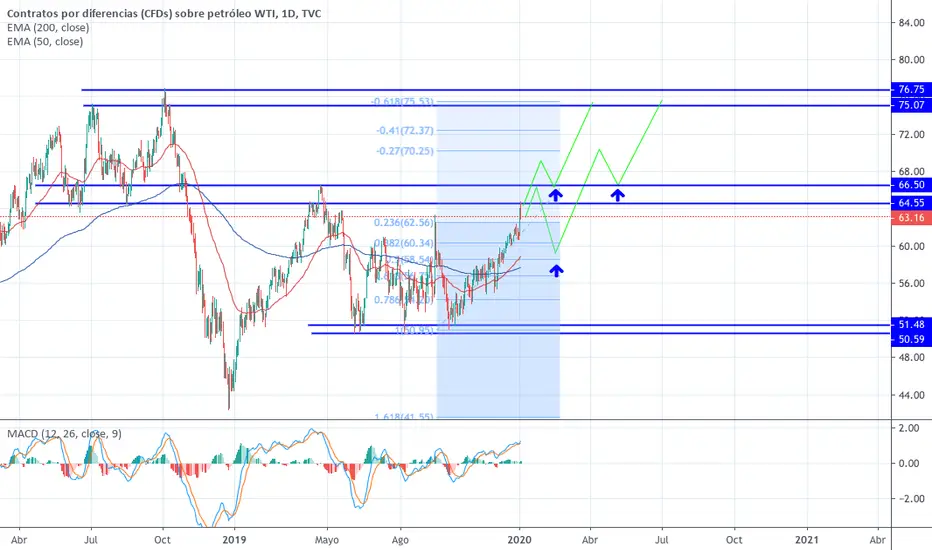 Petróleo mantiene tono alcista si continua las tensiones entre Iran y USA. Actualmente directo a zona de resistencia la cual podria romper o generar alguna corrección antes de continuar las subidas. Zona de probables entradas marcadas.
