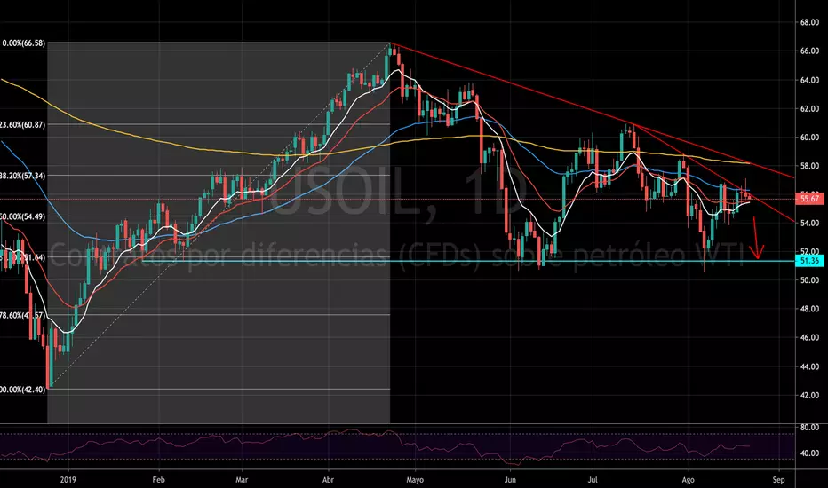 USOIL continúa generando ondas bajistas, con altos cada vez más bajos. Por segunda ocasión, durante el mes de agosto, el precio falla en su intento de superar la línea interna de tendencia bajista y ha comenzado a generar una nueva onda bajista. El precio del crudo ligero se mantiene sobre las EMAs de 20 y 10 días, que sirven como un ligero soporte antes de los $54,4, donde se ubica el nivel 50 del retroceso de Fibonacci trazado desde el inicio del rally alcista de 2019 hasta el máximo establecido en el año en curso, alrededor de los $66.