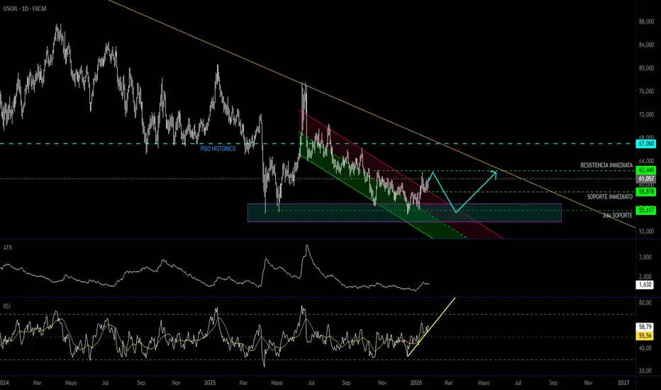 "En el momento actual, el precio no tiene un ATR (Average True Range - Rango Verdadero Medio) muy alto, a diferencia de los dos picos anteriores; en volatilidad está tranquilo por ahora. La probabilidad sería por el canal de desviación estándar (rojo y verde), donde lo ha roto al alza. Al tener dos resistencias en el mismo nivel, podría ir a buscar esos valores para después volver a la resistencia del canal, que también serían los niveles de soportes que ha tenido el precio desde 2025. Desde esos soportes y (con menor probabilidad de eficacia) podría ir a buscar la línea de tendencia bajista que también confluye con los niveles de resistencia actuales."