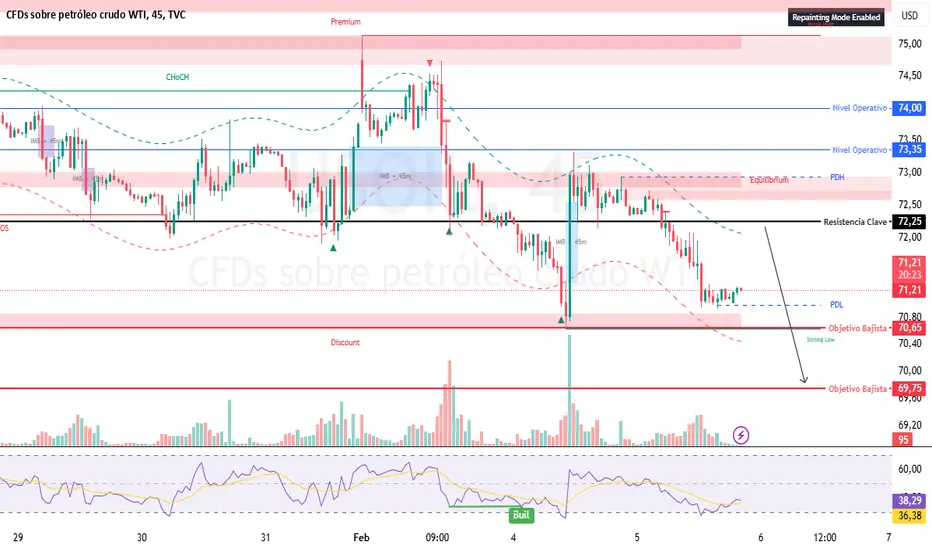 📊 El petróleo podría retroceder hacia 70,65 y 69,75, siempre que el nivel clave de resistencia en 72,25 se mantenga firme. Si el precio permanece por debajo de este nivel, se favorecen posiciones cortas. Sin embargo, si el precio supera 72,25, podríamos observar un movimiento alcista hacia 73,35 y 74,00.