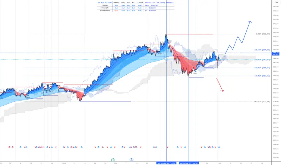 Si observamos la tabla del gráfico, su aspecto es CLARAMENTE ALCISTA ( Bull ) que ha pasado por una fase de retroceso. El retroceso que ha realizado es JUSTO EL 61.8% Fibonacci , Y LO HA RESPETADO. Desde que alcanzó ese retroceso el día 14 de Marzo, el precio no ha parado de subir. En estos momentos está ROMPIENDO ZONAS CLAVE para iniciar un ataque a NUEVOS MÁXIMOS EN EL VALOR. Si supera la zona 352 , irá directamente a máximos , y muy probable los romperá para explorar nuevos precios en el valor.