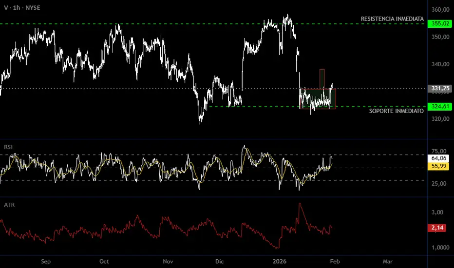 Visa podría haber activado un impulso alcista con el objetivo del tamaño del rango, y puede ser que trate de buscar sus resistencias entre los 355 dólares, acompañan a esta probabilidad la volatilidad alta que marcó el ATR en esa caida y su freno creando un rango, también el valor de RSI que no está en sobrecompra.
