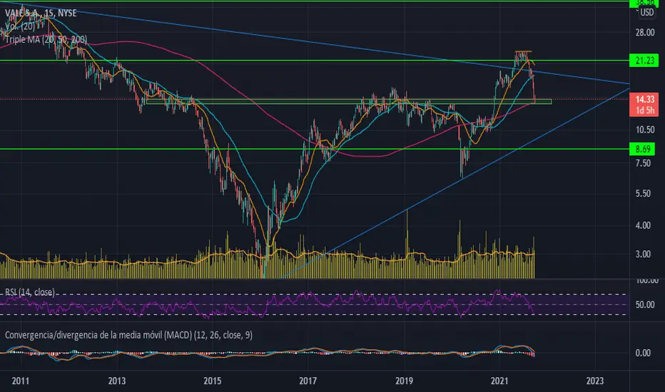 VALE luego de no haber podido romper al alza la zona de 22 dólares, comenzó un movimiento bajista que parece haber encontrado soporte en la media de 200 smenas, que coincide con una zona de el precio ha sabido tener acumulación en el pasado.