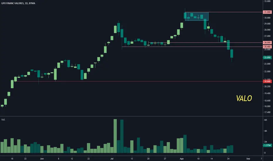al no poder soportar los 26 perdió la condición de alcista. Próximo soporte claro en 21-20.8