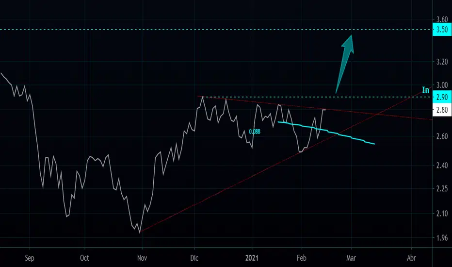 En síntesis: obviamente hace falta superar esa cuña roja... pero el desarrollo lateral me sugiere que no alcanza sólo con eso sino que sería bueno aguardar confirmación de que no haya un doble techo, por lo que yo esperaría a cerrar sobre 2.90 y controlar al día siguiente cómo sigue el humor del mercado.