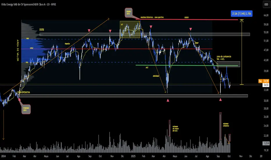 El precio de VIST retrocedió hasta niveles de febrero de 2024, luego de un impulso alcista histórico que la llevó a máximos por encima de los 60 USD.