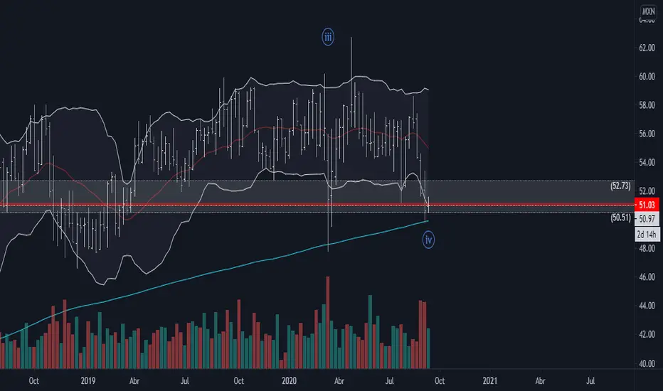 Estamos largo en walmex mientras se mantenga en la parte superior del MA200 en gráfico semanal y dentro de las bandas de Bollinger , ambos indicadores son nuestra zona de stop.