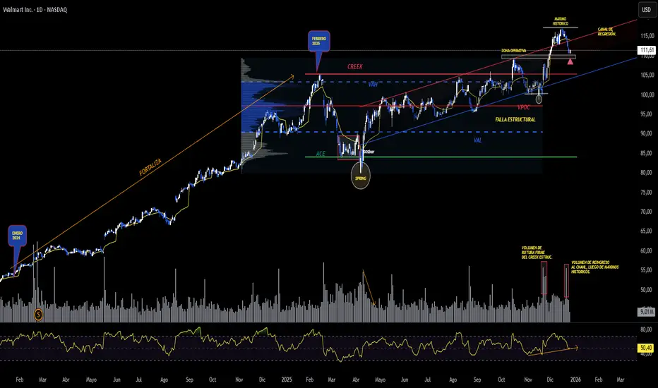 Walmart viene respetando un canal de regresión alcista nacido desde el spring + test que actuó como verdadero punto de inflexión de la estructura.
