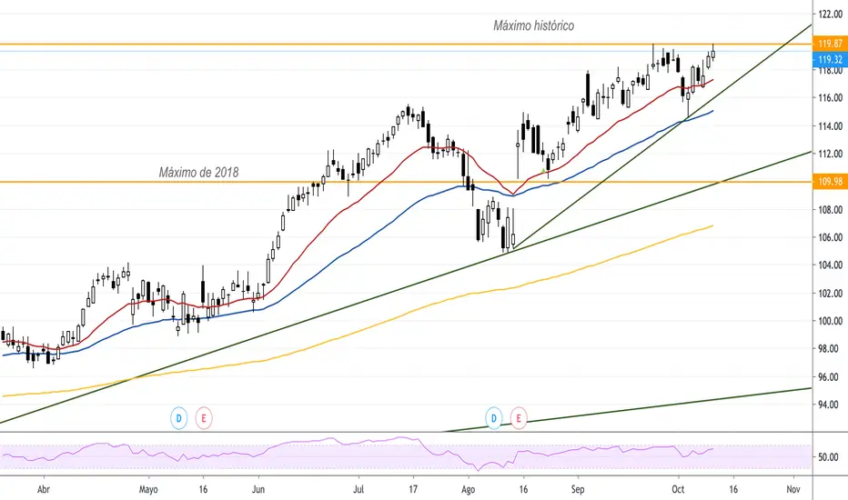 Este nuevo alto histórico supera el alto interior, tan sólo por un centavo. Por lo que alrededor de los $120 se mantiene un nivel de resistencia actual para el precio de la acción. Si el precio no lograra superar dicho nivel en las próximas sesiones, probablemente estaremos viendo retrocesos cercanos a los $115 donde reposa la EMA de 50 días.