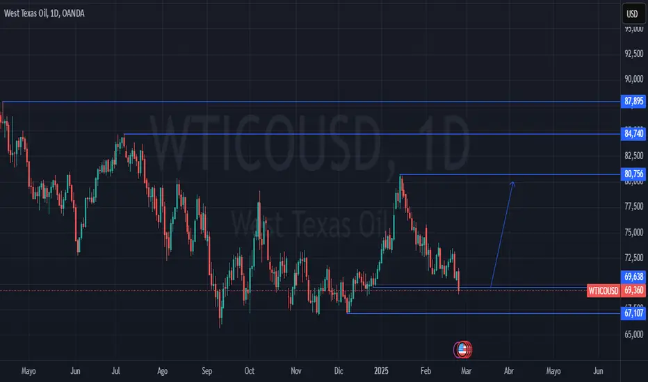El gráfico diario del Petróleo West Texas muestra una tendencia alcista a largo plazo, con un soporte clave en torno a los $69,360. Recientemente, el precio ha experimentado una corrección y se encuentra cerca de este nivel de soporte. Si este soporte se mantiene, podríamos ver un rebote y un posible retorno a los máximos anteriores en torno a los $87,895. Sin embargo, una ruptura por debajo de $69,360 podría abrir la puerta a una mayor caída. Los traders deben monitorear de cerca este nivel clave para identificar posibles oportunidades de compra o venta.