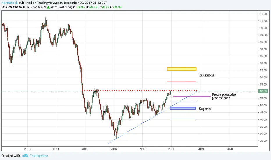 Sus resistencias históricas marcadas en amarillo muestran niveles de precio bastante altos, lejos de lo que los expertos tienen planeado (al rededor de los $56 dolares por barril) lo cual parece interesante. Habrá que ver como se desarrolla pero siempre es bueno ir de periodos en gráfica largos a cortos y así tener un marco de trabajo mucho mas estructurado.