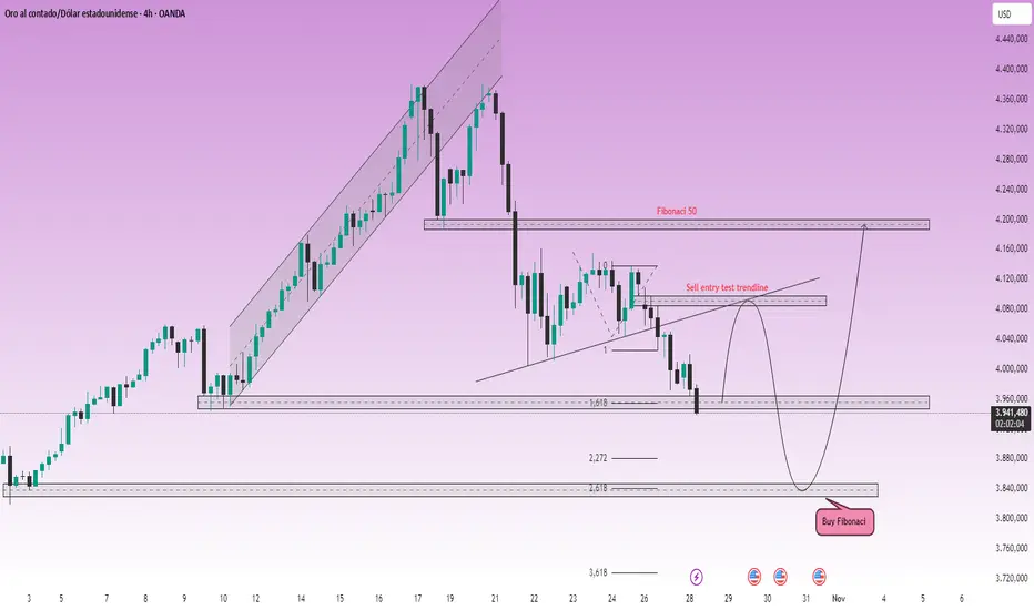 Nivel Fibonacci Actual: El precio está tocando y reaccionando en la zona Fibonacci 1.618 (alrededor de $3950).
