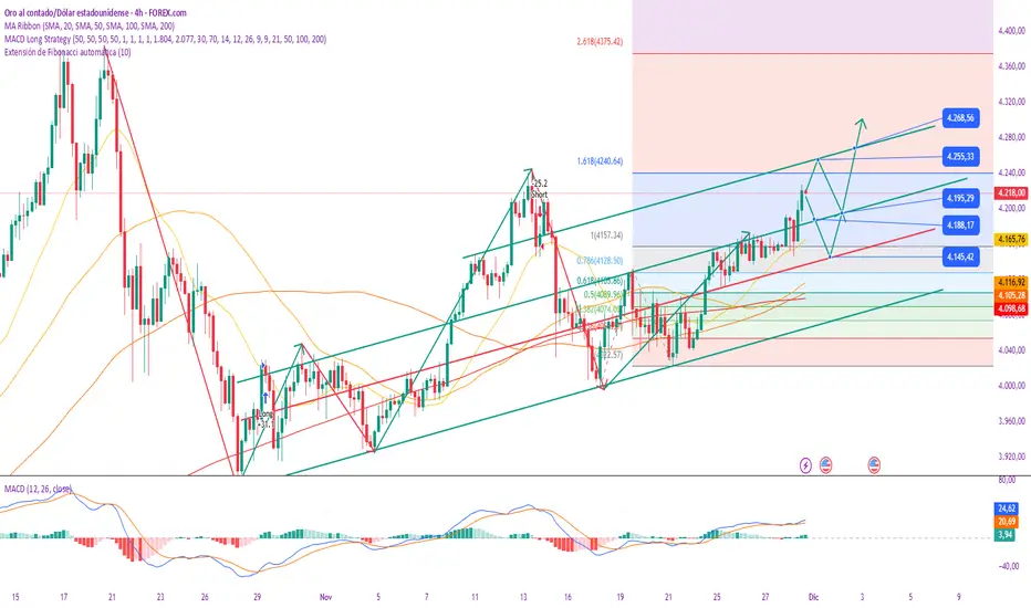 Operando dentro de un Canal Ascendente: Los retrocesos hacia el borde inferior del canal (4170-4180) han encontrado repetidamente soporte de compra, mostrando claras características de inversión entre soporte y resistencia.