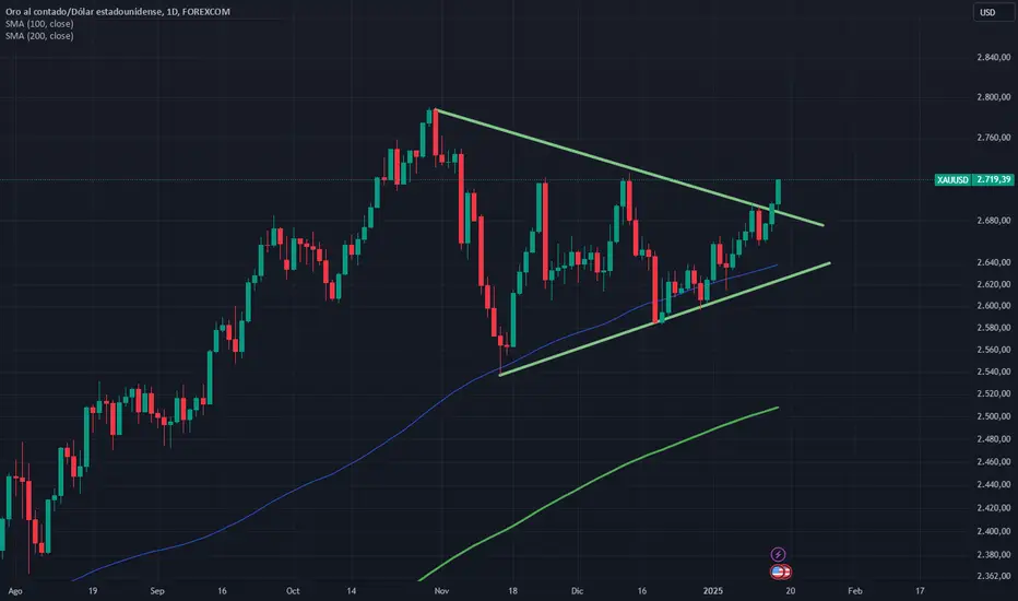 El gráfico diario del oro nos muestra una formación técnica muy interesante. Después de varias semanas consolidándose dentro de una cuña alcista, finalmente hemos visto una ruptura al alza, lo que podría marcar el inicio de un nuevo tramo impulsivo.