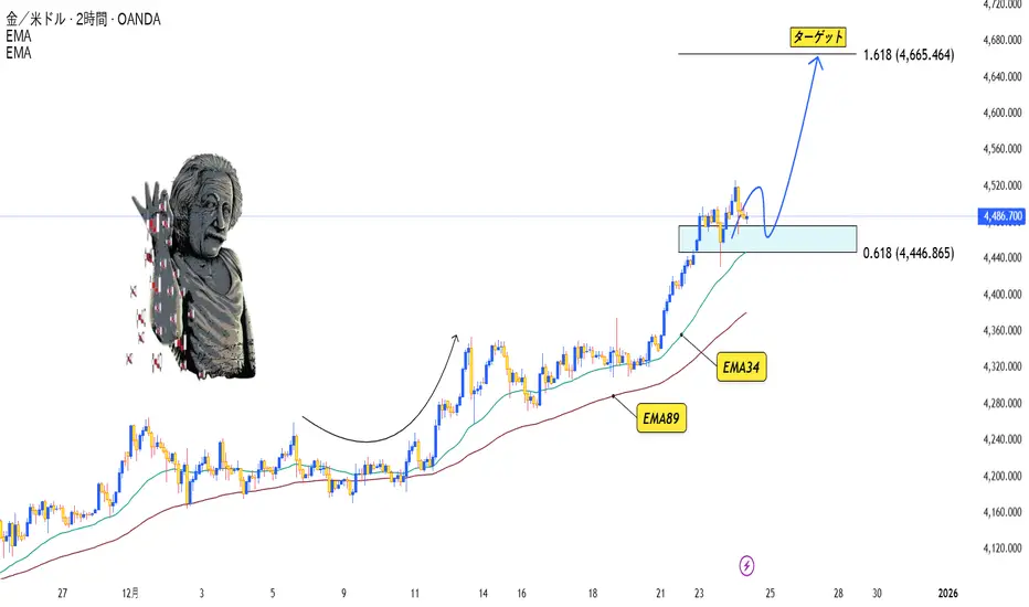 上昇モメンタムは依然として力強く、価格はEMA34/89を上回っています。強い衝動的な動きの後、金は需要ゾーンである0.618付近へのテクニカル調整局面にあります。これはフィボナッチとEMAの合流点であり、売り圧力を吸収する可能性が高いと考えられます。