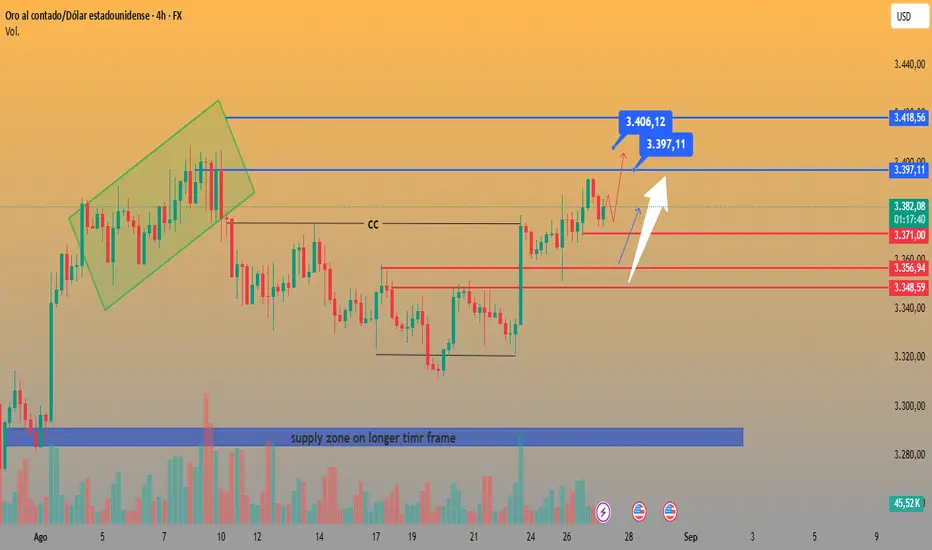 La estructura alcista actual sugiere que, mientras el precio se mantenga por encima de 3,371 USD, los compradores podrían seguir impulsando el precio hacia niveles superiores.