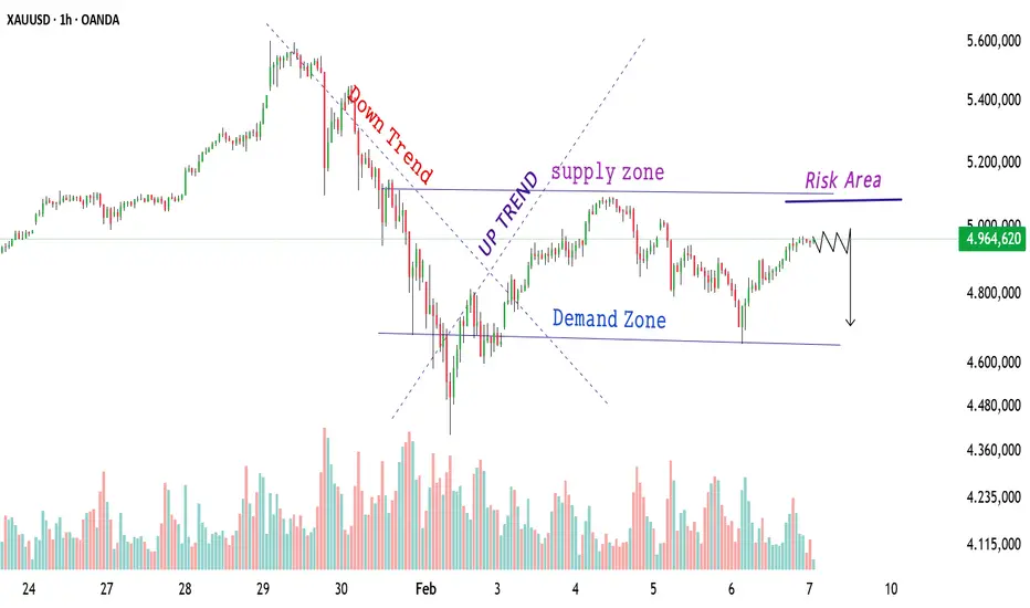 El movimiento del precio del oro muestra una estructura equilibrada después de una fuerte caída y una recuperación desde niveles bajos. Los compradores defendieron previamente la zona de demanda alrededor de 4.650–4.700, donde la presión vendedora disminuyó y el precio se estabilizó. Esta zona sigue siendo un soporte clave y puede atraer nuevamente interés comprador si el precio cae.