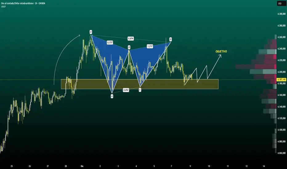 El precio se mantiene por encima de la zona de demanda → acumulación limitada → puede crear una onda de empuje hacia 4230 - 4250, donde convergen el perfil de volumen y la resistencia cercana.