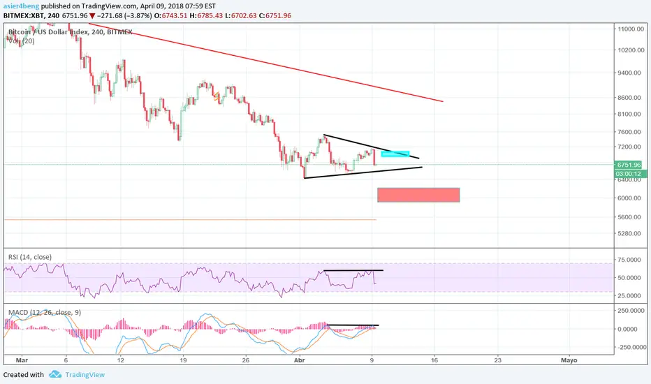 Banderín bajista con divergencias en el RSI y el MACD. Toca esperar a que suba a la parte superior del banderín para meter el corto. Si rompe la base directamente, no se lleva a cabo la operación.