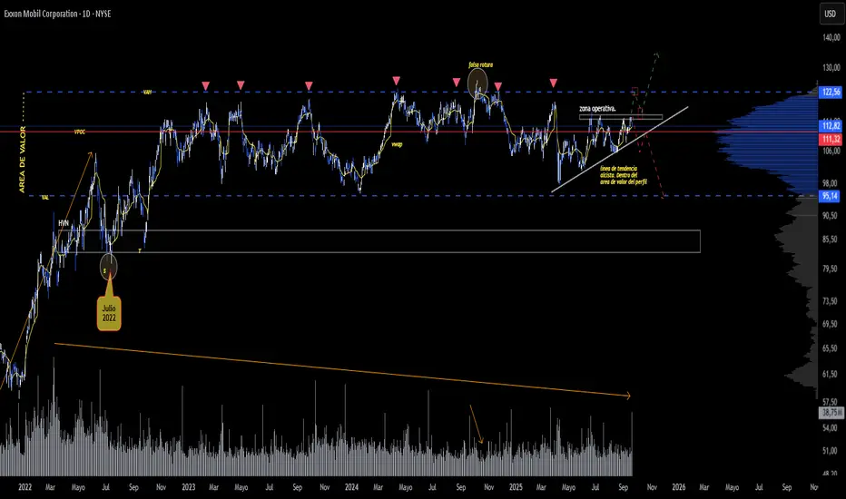 • Desde mediados de 2022, XOM se encuentra en un amplio rango lateral dentro del área de valor marcada por el perfil de volumen.