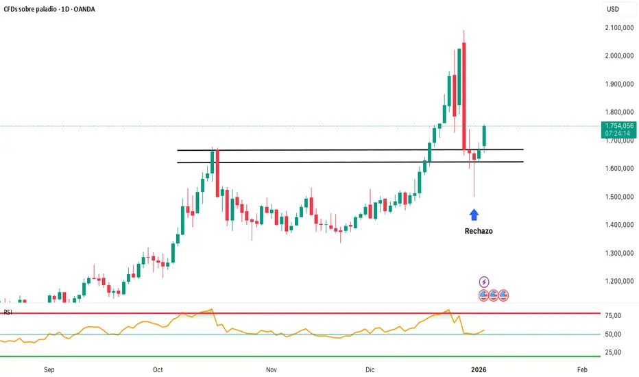 Se observa que XPDUSD hace unos días se encontraba en zona de sobrecompra según el RSI, lo que dio lugar a una corrección hacia el área de 1.650,00. En ese nivel, una resistencia previa pasó a actuar como soporte, y el precio reaccionó al alza, dejando una mecha de rechazo clara, señal de entrada de compradores.