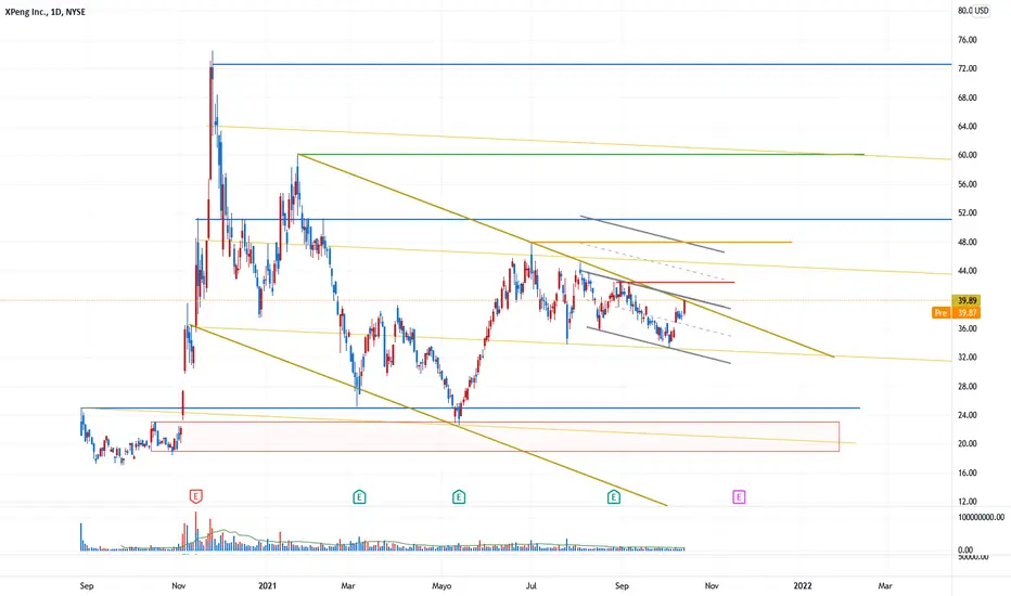 📊 Xpeng, salió a cotizar en el mercado a precio de 23,00$ a final de Agosto de 2020, donde experimentó rápidamente un incremento del precio hasta el actual máximo histórico de 74,00$. Es decir un aumento del 220% en tan solo 3 meses. Actualmente, si analizamos el gráfico, y mediante el uso de la metodología TRART de MDTA, podemos observar como después de un gran retroceso del precio hasta niveles de 25,00$, el precio ha crecido hasta el rango actual de 40,00$. Donde nos encontramos en una gran oportunidad de entrada. Buscando así los primeros objetivos de ruptura en 43,00$ y 48,00$. Para más adelante buscar el objetivo de máximos en la zona de 75,00$.