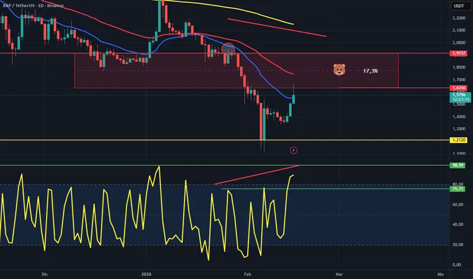 Actualización del token #XRP en gráfico de un día. El activo presenta una divergencia bajista combinada con una sobrecompra extendida.