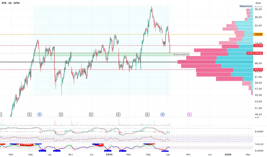 Odkładając na bok negatywny sentyment i dużo wpisów na x, to rynek wraca do miejsca, w którym przez większość minionego roku formował solidną bazę kapitałową. Od przyjęcia lub odrzucenia tej bazy zależeć będzie, czy na XTB zobaczymy jedynie zdrową, wolumenowo uzasadnioną korektę, czy początek głębszej zmiany dominującego sentymentu. Do czasu rozstrzygnięcia warto traktować 66,5 zł oraz zieloną strefę 69-70 zł jako pivot: powyżej – scenariusz reakumulacji i budowy nowego ruchu w górę w którym pierwszym oporem będzie poziom 73 zł, natomiast poniżej – logiczne przyspieszenie do 63,7 zł, a dalej ewentualnie głębiej.