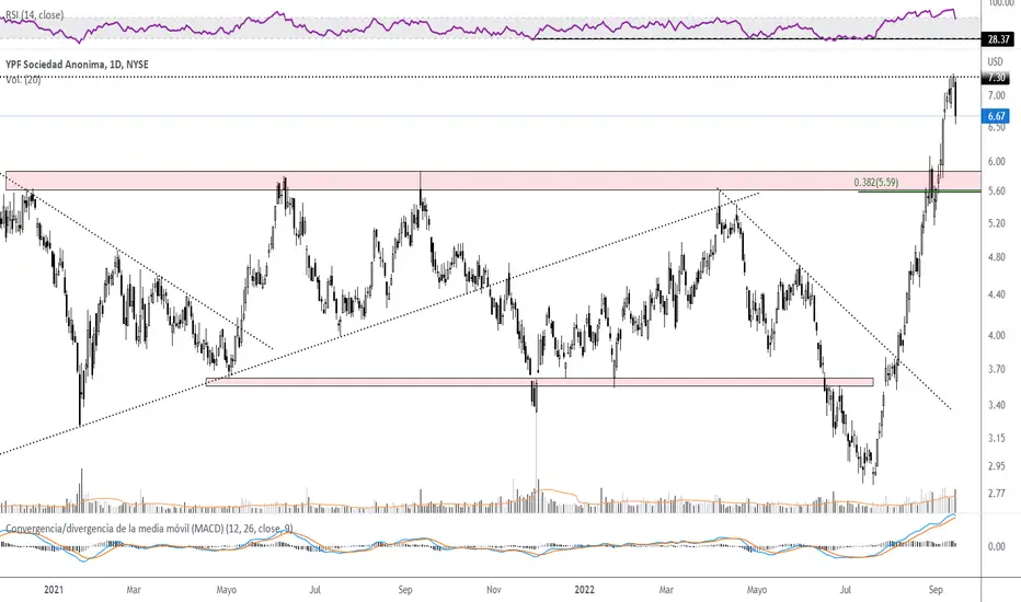 YPF convirtió los "mediano plazo" en corto plazo y ejecutó el movimiento completo del impulso alcista por encima de los 5.50/5.80 en pocos días, llegando a los 7.30 sin pausa, freno, ni dudas.