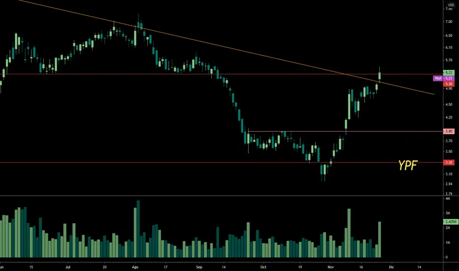 cruza la zona de la tendencia bajista y la resistencia en 5.3 con volumen, para seguir mañana si logra quebrar. La suba en el sector energético aporta viento a favor.