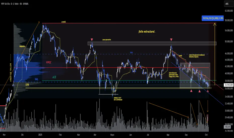Luego de alcanzar su zona operativa en torno a los 50.000 ARS y fallar en la ruptura de resistencia (falla estructural), el precio inició un movimiento correctivo controlado, manteniéndose dentro de un canal de regresión bajista que actualmente delimita la fase de lateralización.