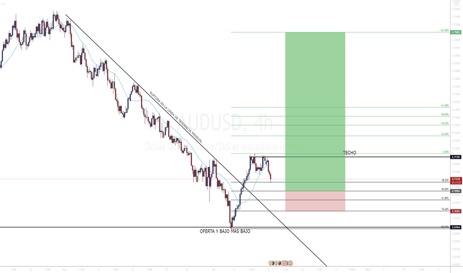 COMPRA EN AUDUSDEl precio llego a un bajo + bajo y la ruptura de la linea de tendencia que fue respetada durante todo el mes de diciembre en la posterior caida me da la confirmacion necesaria de la subida del audusd, estare abrienndo mis compras sobre el 50% del fibonacci o 61.8% stop loss sobre el 76.4% de mi fibo, recuerden usar siempre 1% de riesgo sobbre cada operacion.