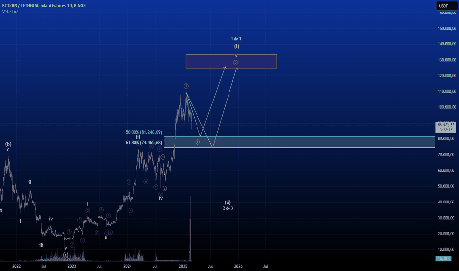 Mi proyeccion de Bitcoin para este 2025Mi proyeccion segun mi conteo de elliot y ciclo de mercado es que a Bitcoin aun le queda realizar un nuevo maximo antes de empezar nuevamente un bearmarket, pienso que esto podria llegar a los 126/131k aprox, y que en estos momentos estamos teniendo una correccion de una sub onda 4 de 5, donde el precio para NO INVALIDAR LA IDEA deberia rebotar en los 81/ 74k como maximo para ir sobre nuevo maximo y cerrar la onda 1 de ciclo mayor, si no se entiende ahi estan las flechitas saludos