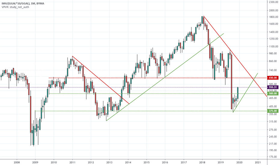 IMV en US$ CCL - Contra las cuerdasSerá importante que al inicio de la semana del 27/1 pueda reaccionar al alza, reconociendo la anterior resistencia de la zona de 480 como nuevo soporte. Esta zona es, además, un retroceso de 0,5 de Fibonacci. El segundo objetivo es romper la tendencia bajista desde el máximo del 9/8. De seguir la baja, irá por el soporte dinámico vigente del 4/9.