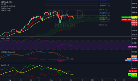 MERVAL Actualización semanal del Merval, encontró soporte en base de canal dejando un típico patrón de reversión alcista, siendo primer punto para posicionarse a compra (sin confirmación, pero los riesgo los asume uno) , segundo punto optimo para empezar a ir long una vez ubicados por encima de la exponencial de 20, y el mas importante y el que dio la confirmación fue una vez superada la zona de los 27600 puntos, desde allí era comprar con menor riesgo y se podía observar recorrido en el índice, ahora nos encontramos muy cercanos al objetivo por desdoble, por lo cual lo mejor (al menos por el lado del AT) es tomar ganancias y esperar lo mas liquido posible, sea un quiebre o reconocer el techo y posicionarse short en el índice. Veremos como actúa, ojala que siga la fiesta verde!! Mantengo lo que mencione en otros análisis, una vez que salga la noticia de la reforma puede que exista una toma de ganancias importante, la típica compra con el rumor, vende con la noticia. Vemos un RSI sobre comprándose, aún le queda recorrido, mientras que MACD con una distancia muy importante con la linea de señal.