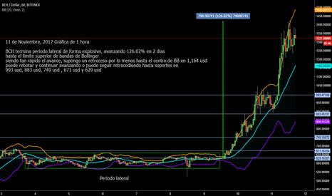 BCH, posible retroceso11 de Noviembre, 2017 Gráfica de 1 hora BCH termina período lateral de forma explosiva, avanzando 126.02% en 2 días hasta el límite superior de bandas de Bollinger siendo tan rápido el avance, supongo un retroceso por lo menos hasta el centro de BB en 1,164 usd puede rebotar y continuar avanzando o puede seguir retrocediendo hasta soportes en 993 usd, 883 usd, 749 usd , 671 usd y 629 usd BCortopor ibursatil113