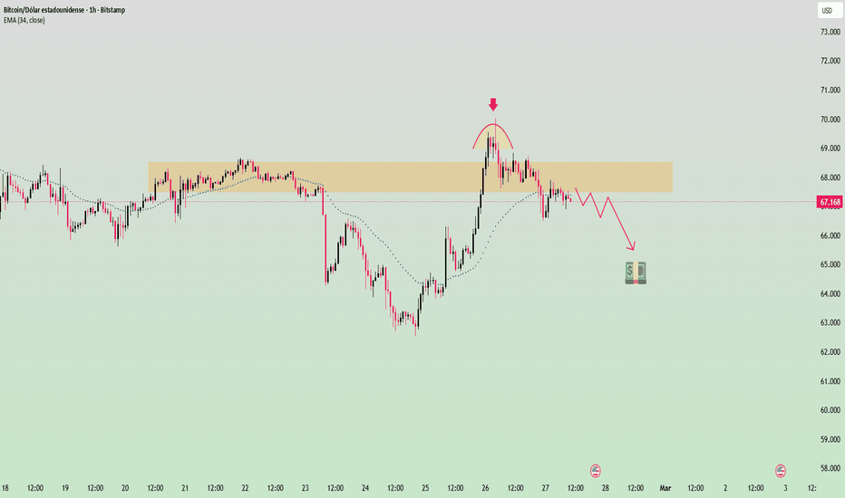 BTC – Nuevo día de presión a la bajaEl precio se rechazó fuertemente en la zona de oferta 68,5 - 69,5 y formó una estructura de pico gradualmente más baja según el modelo de distribución a corto plazo. EMA34 comienza a curvarse hacia abajo → el impulso alcista se debilita.