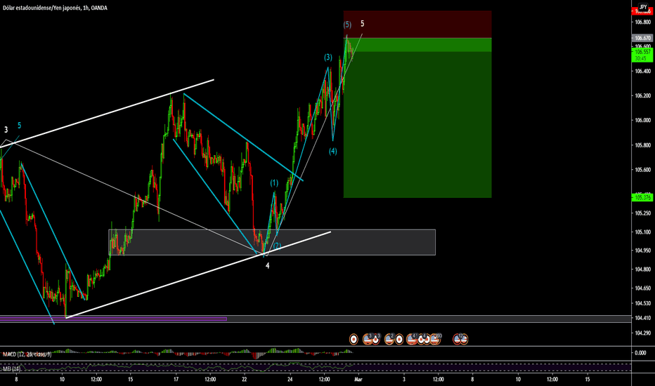 USDJPY - ONDA IMPULSIVA 3 Interpreto un primer impulso como onda (1). En esta onda (1), los impulsos y retrocesos ( Subondas 1, 2, 3, 4 y 5) tuvieron coeficientes fibonacci bastante precisos tanto en retrocesos como en extensiones. Luego de esta onda impulsiva (1) interpreto la onda retroactiva (2) como un zigzag simple con sus respectivas subondas a, b y c. Este zigzag y esta ultima subonda c respetaron muy bien el canal fibonacci trazado desde las subondas 3-5-4 de la onda (1). Entiendo que actualmente podriamos estar ante una subonda 1 de la siguiente onda impulsiva (3). Entiendo que esta onda (3) podria ser mi onda extendida, ya que, en la onda (1), mi onda extendida fue la 3, como es normal. Dicho esto, esperaria el final de la subonda 2 en un coeficiente fibonacci para entrar en compra en la siguiente subonda (3) que se puede esperar que sea la extendida para un posible 3 de 3 extendida.