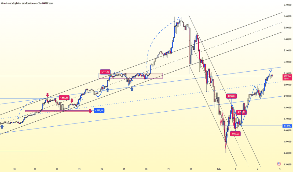 Retroceso correctivo dentro de una estructura alcista generalEl oro (XAUUSD) en el marco temporal de 1 hora mantiene una estructura alcista de fondo, aunque el precio se encuentra actualmente en una fase correctiva. Tras alcanzar un máximo importante, el mercado sufrió un fuerte rechazo en la línea de tendencia descendente (en rojo), lo que provocó una caída impulsiva.