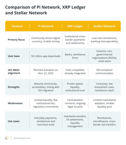 Pi Network differentiates itself through its strategic alignment with the ISO 20022 transition and its focus on emerging markets. Its strengths include accessibility and broad community reach, but it currently lacks the institutional partnerships, liquidity and proven track record of the XRP Ledger and the Stellar Network.