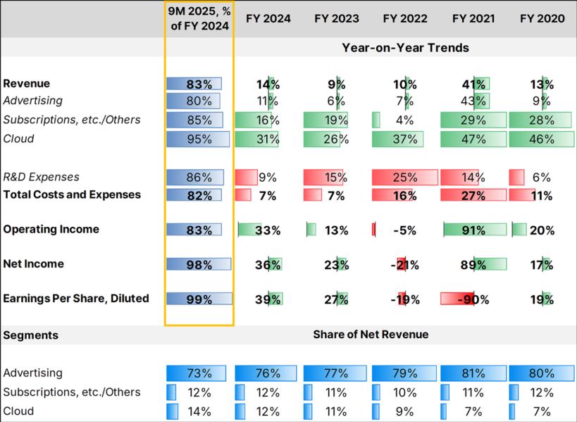 If trends over 9M 2025 continue, total revenue will be around 11% higher than that in FY 2024. Unlike with Meta, however, the bottom line trend is different: earnings per share are already running par with that of the entirety of FY 2024. If trends continue, earnings per share for the full year will be 25% higher.